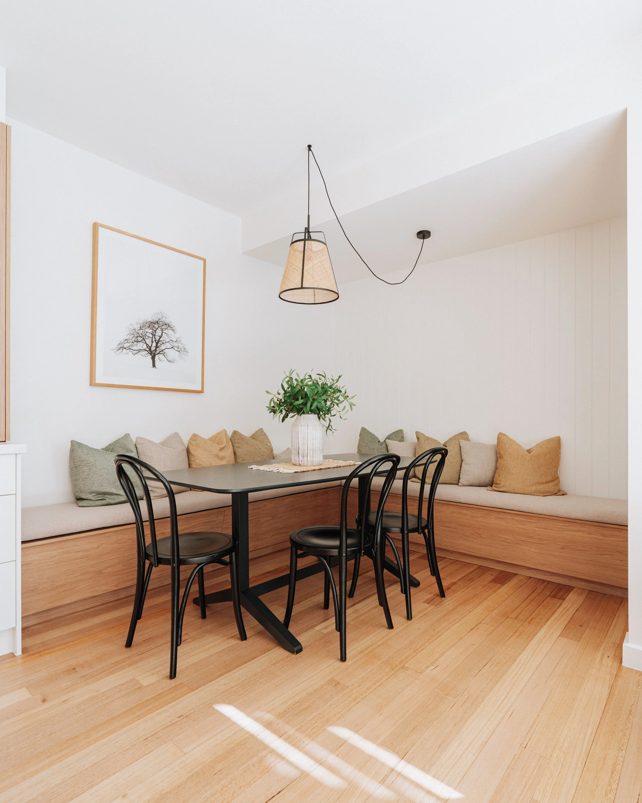 Perhaps the cleverest design decision was flipping function on its head. Instead of letting a laundry dominate precious real estate, Roxanne and Jim moved it to an old bathroom. This allowed for the creation of stunning built-in banquette seating in the dining zone, a space-maximising move that feels as sophisticated as it is practical.