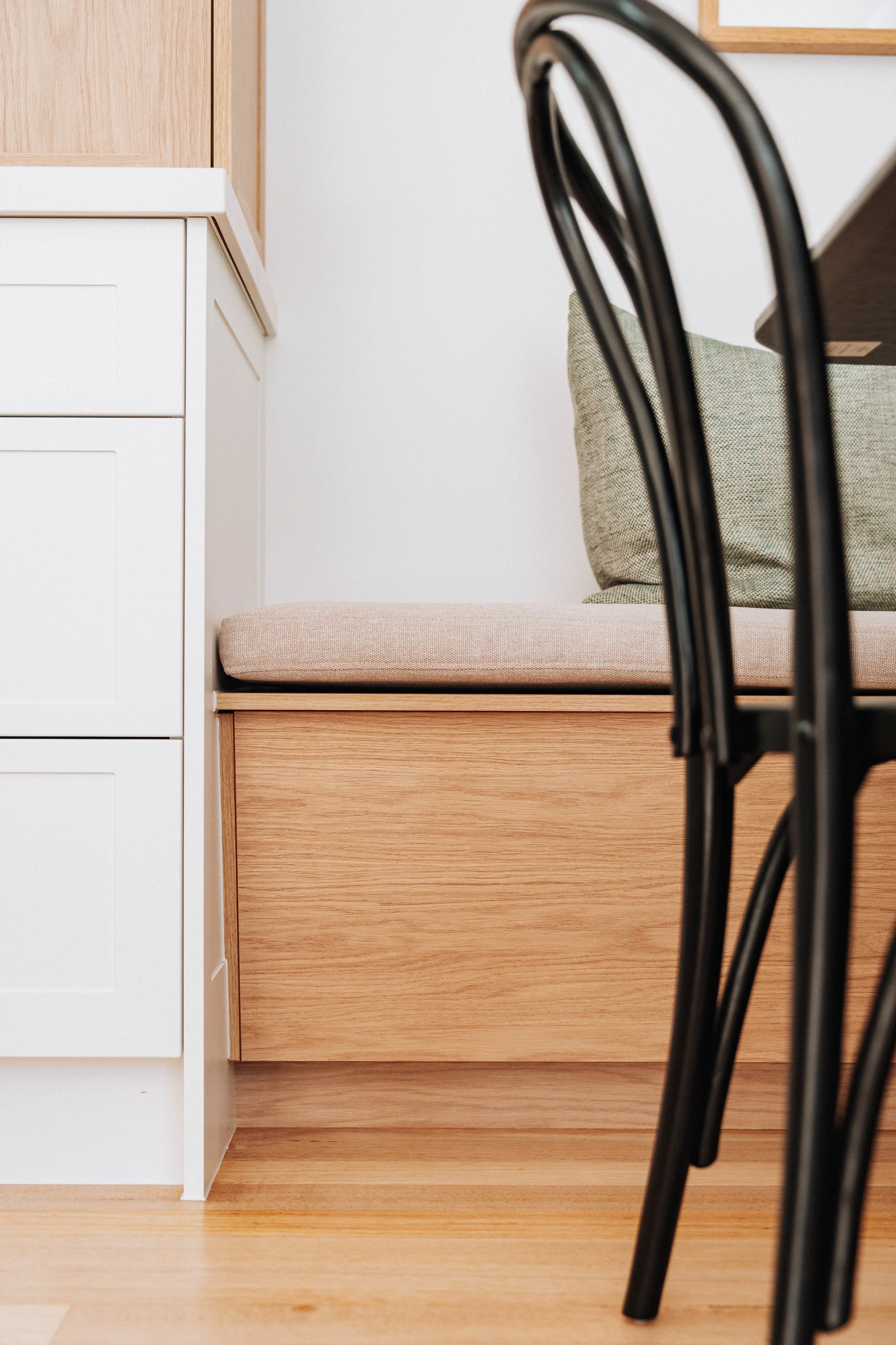 Clad in Polytec Boston Oak Woodmatt to echo the kitchen, the banquette flows into the cabinetry with grace. It anchors the room, adds warmth, and makes you want to linger longer. Overhead, Hafele warm strip lights cast a soft glow, inviting you to settle in with a glass of wine or morning coffee.