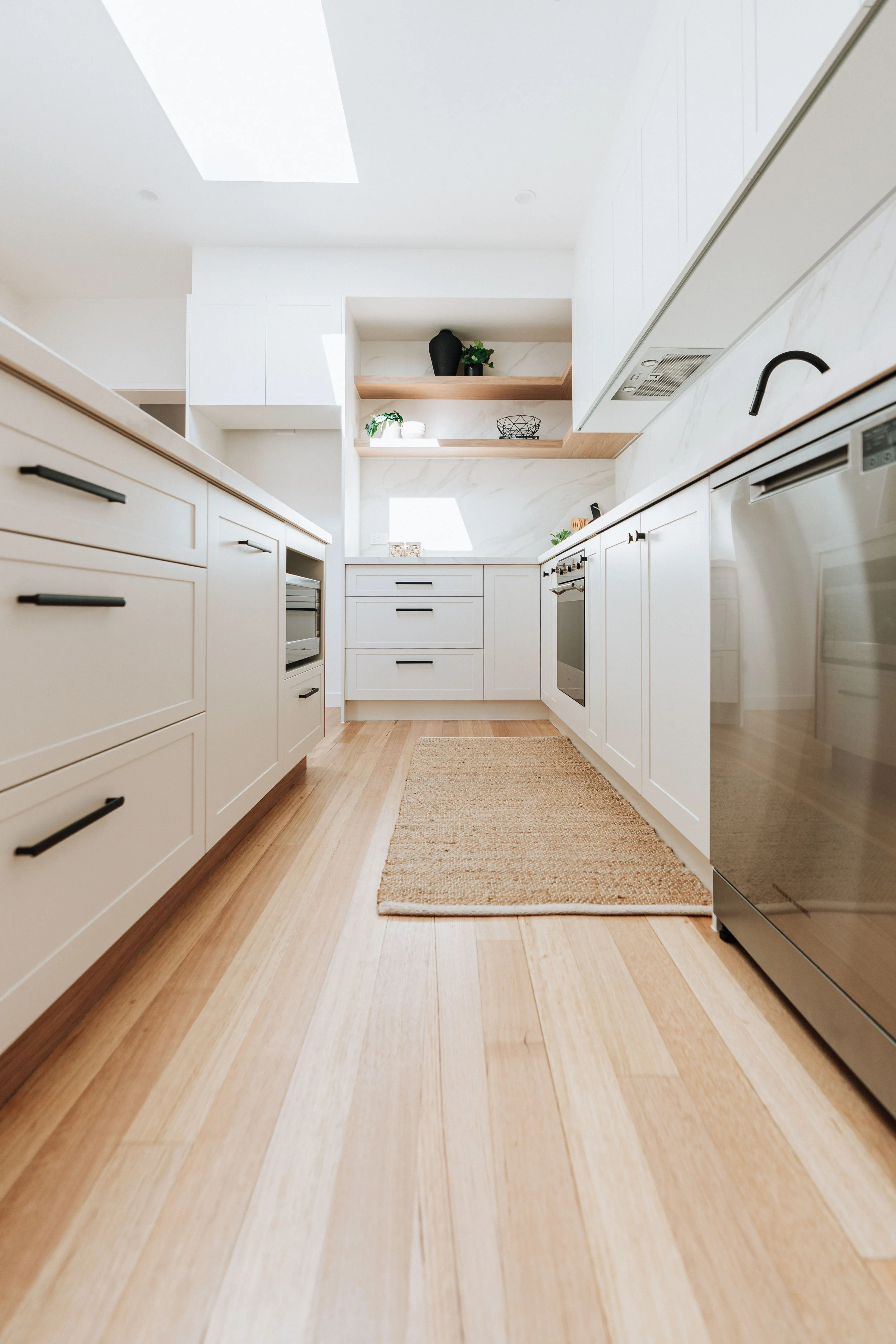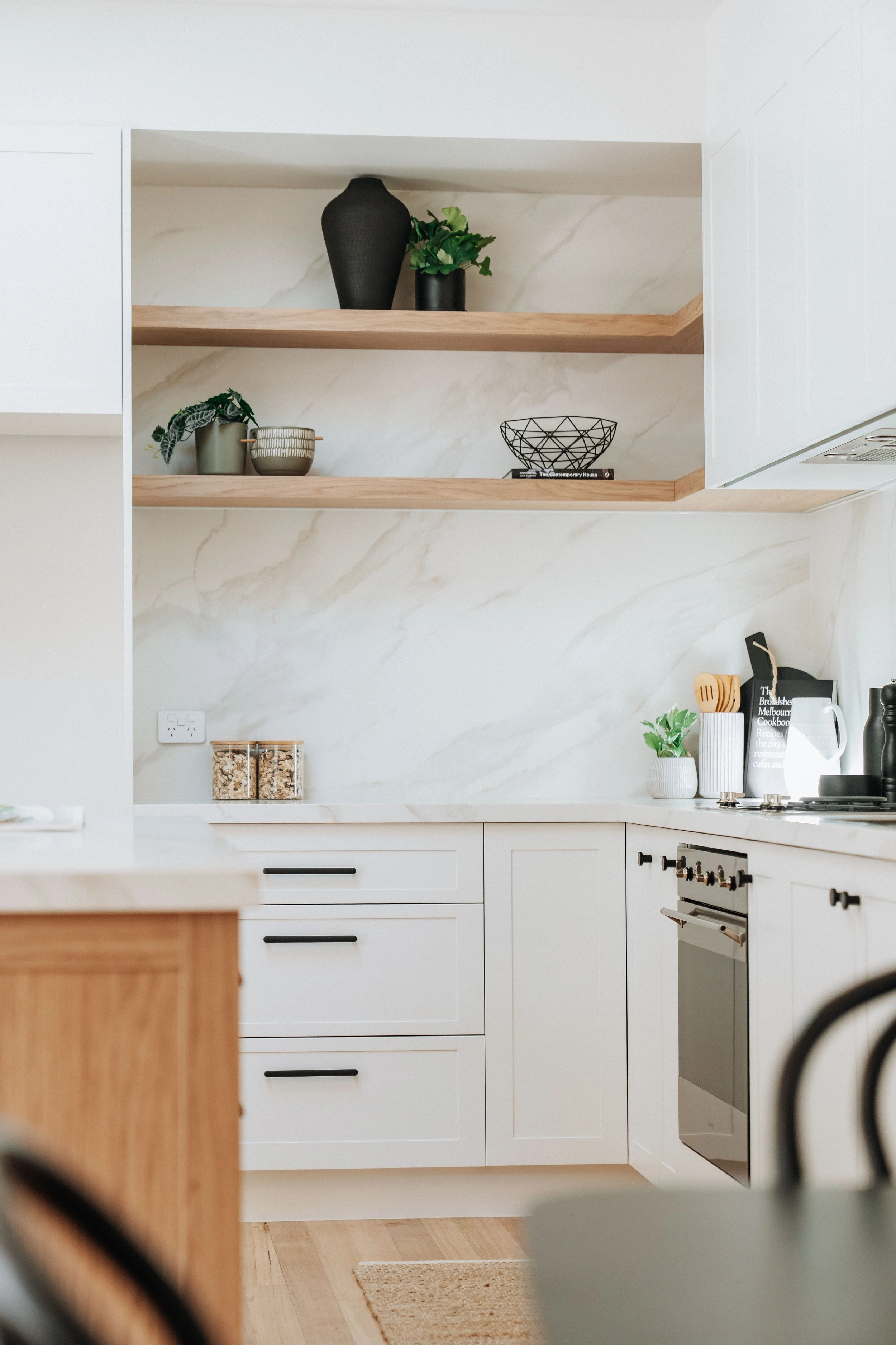 This was paired beautifully with the Polytec 2 Pack Satin Hampton profile in Blossom White for the rest of the cabinetry. The result is an elegant, soft contrast that balances the warmth of timber with a chalky, calming white - a colour that appears to shift slightly throughout the day, depending on the light.