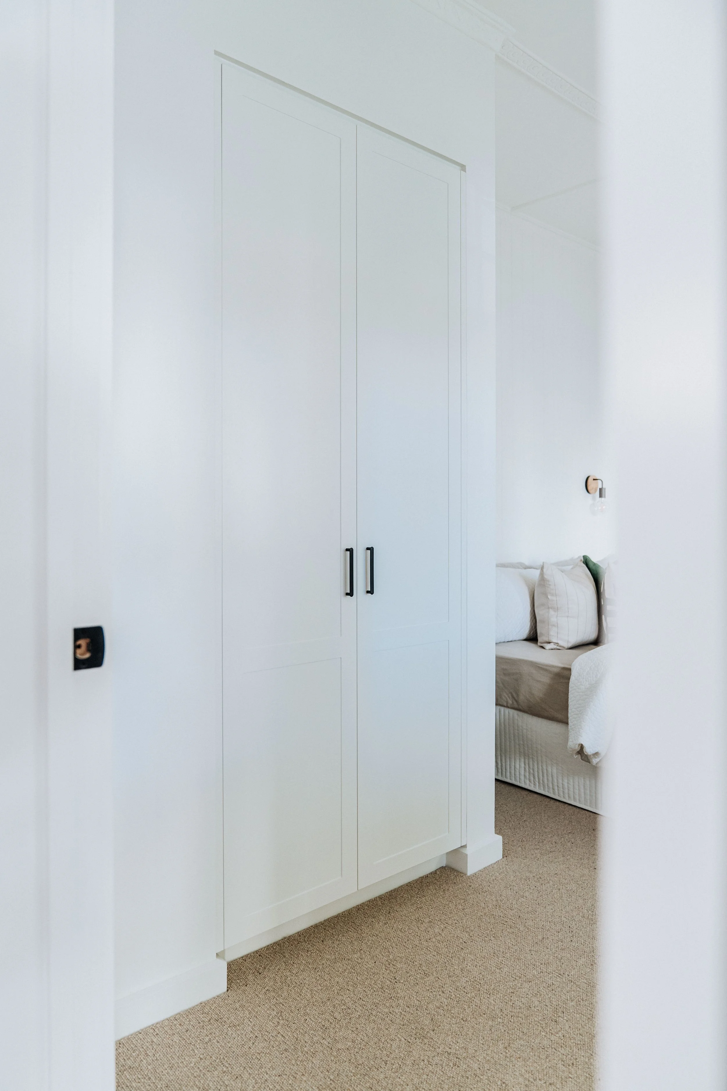 The built-in robe in white references the same Hampton profile as the kitchen and brings everything full circle – functional, refined, and effortlessly elegant.