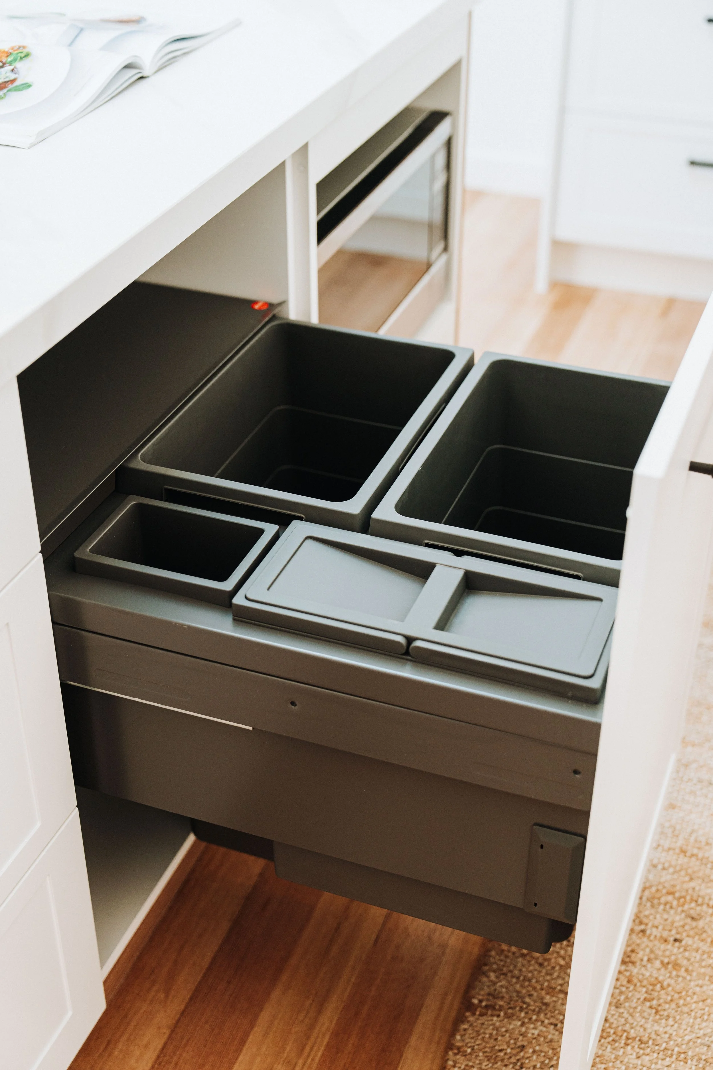 Speaking of smarts, Roxanne didn’t stop at surfaces. Her favourite features? The Hafele Hailo Euro Cargo ST60 bin system, a recycling dream with four tidy compartments, and the Hafele Kesseböhmer Carousel 270 corner unit, which turns wasted space into a rotating sanctuary for pots and pans.