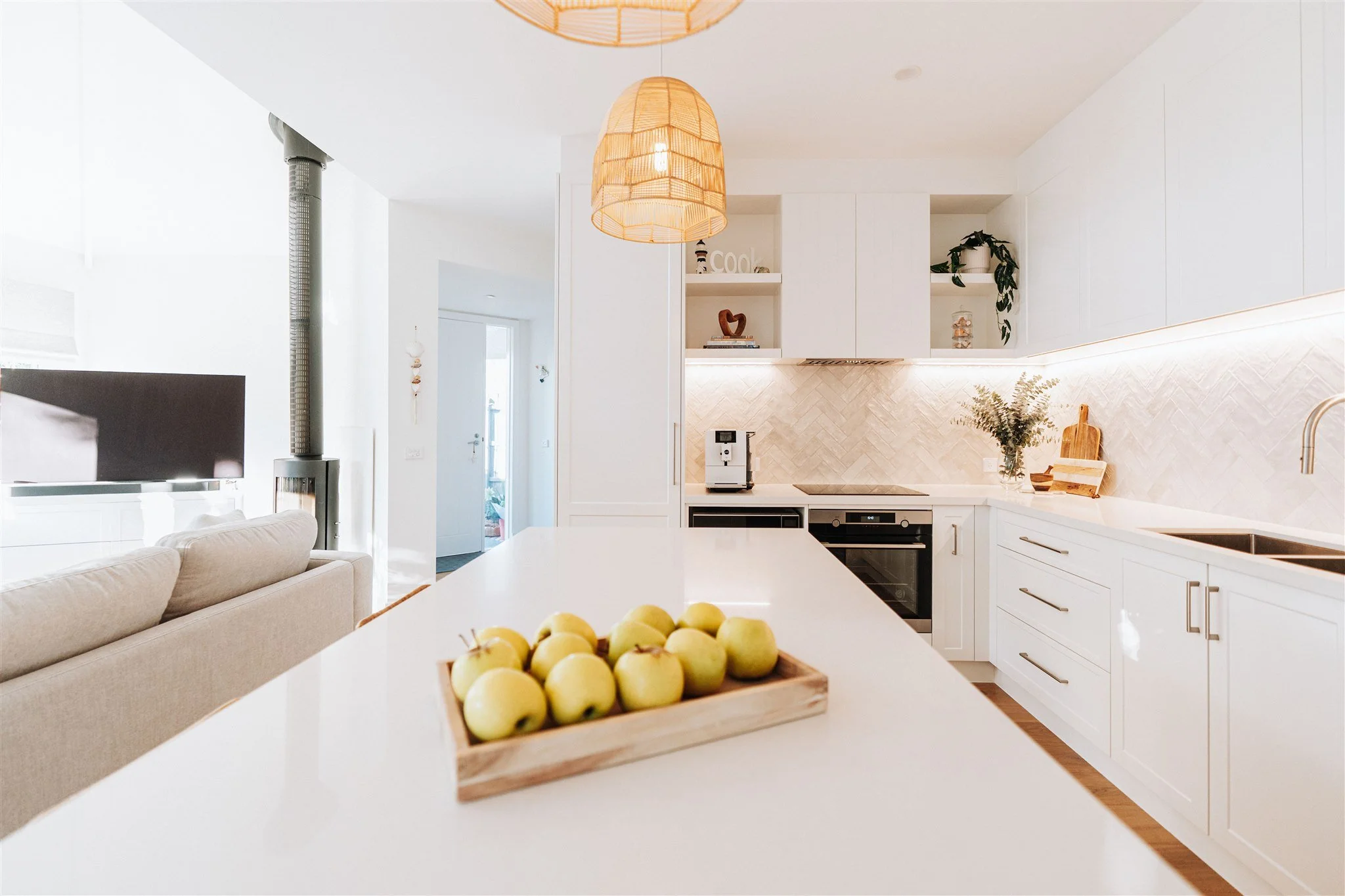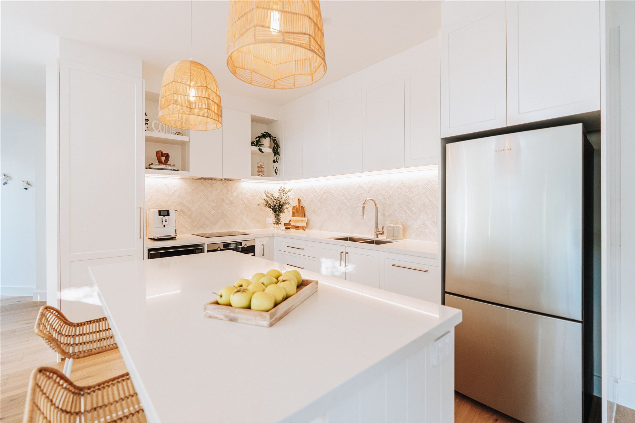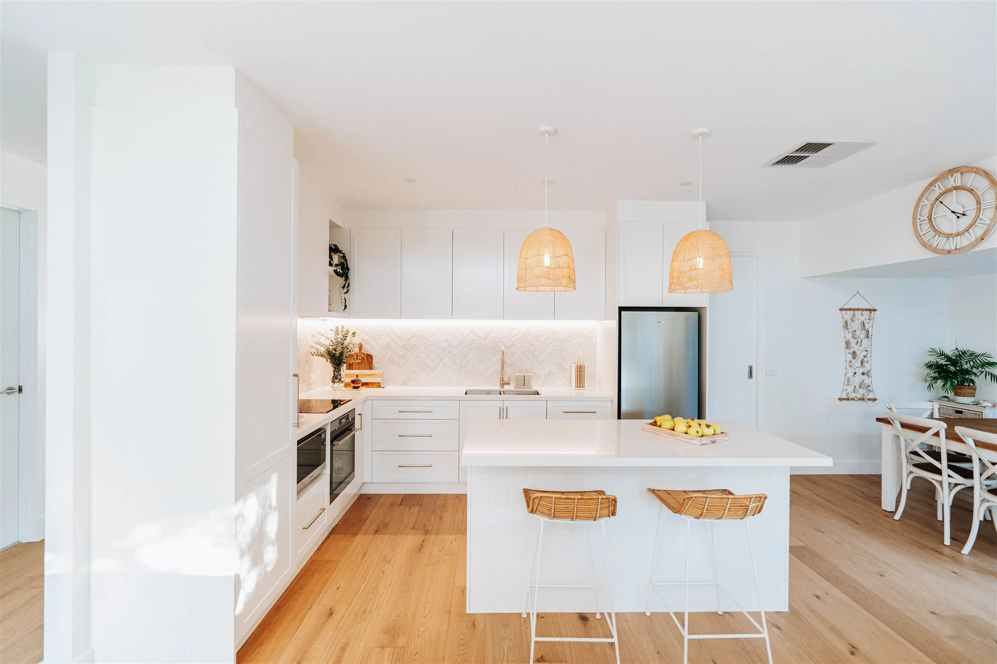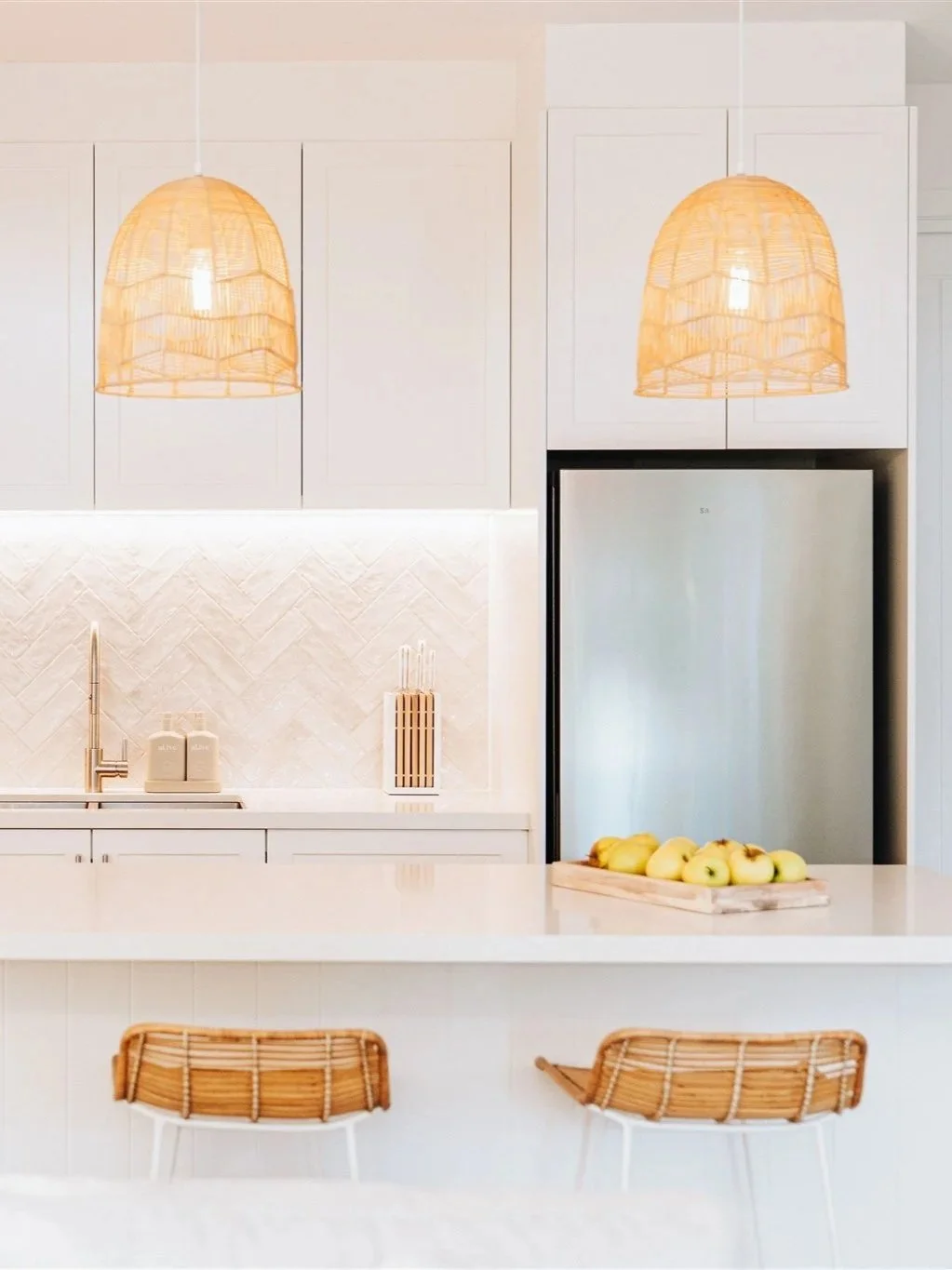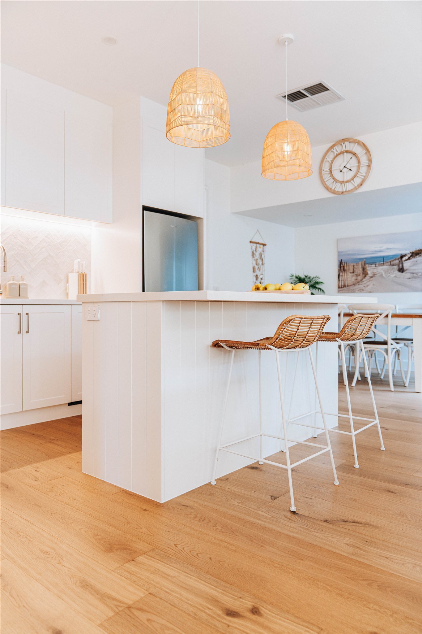 The finishing touches include Adairs Cebu Rattan Counter Stools and Ivory & Deene Amalfi Rattan Lace Pendant Light-Natural, both of which bring texture, warmth, and that unmistakable breezy ease that makes the space feel lived-in and loved.