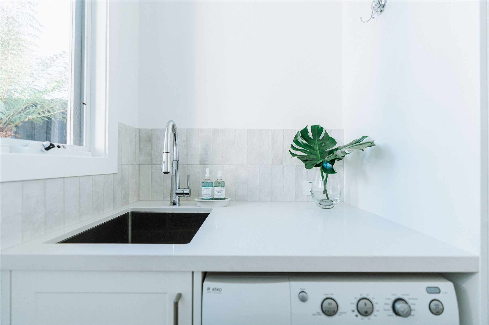 In the laundry, the same tile was used again, but laid vertically for a different look with the same DNA. It’s a clever, cohesive decision: consistent material, fresh expression.