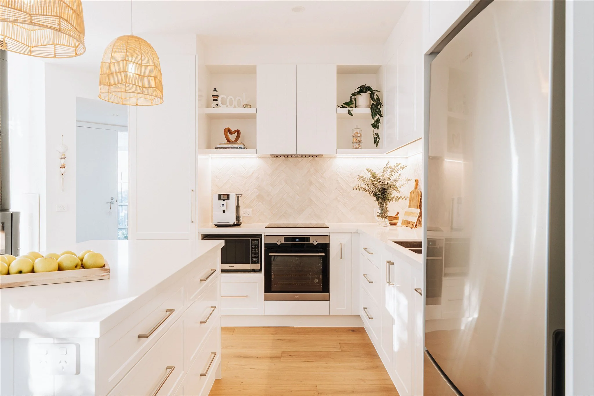 Jen’s styling choices deserve their own applause. The rattan lights, the meaningful details, the relaxed Hamptons mood… it all lands with confidence, with Interior Design by Kirstin Sweet (Styled Haus) working alongside Jen to help guide and shape the vision. There’s a reason this kitchen feels like it belongs in Hampton - while also quietly nodding to Noosa and a late afternoon G&T. Delish.