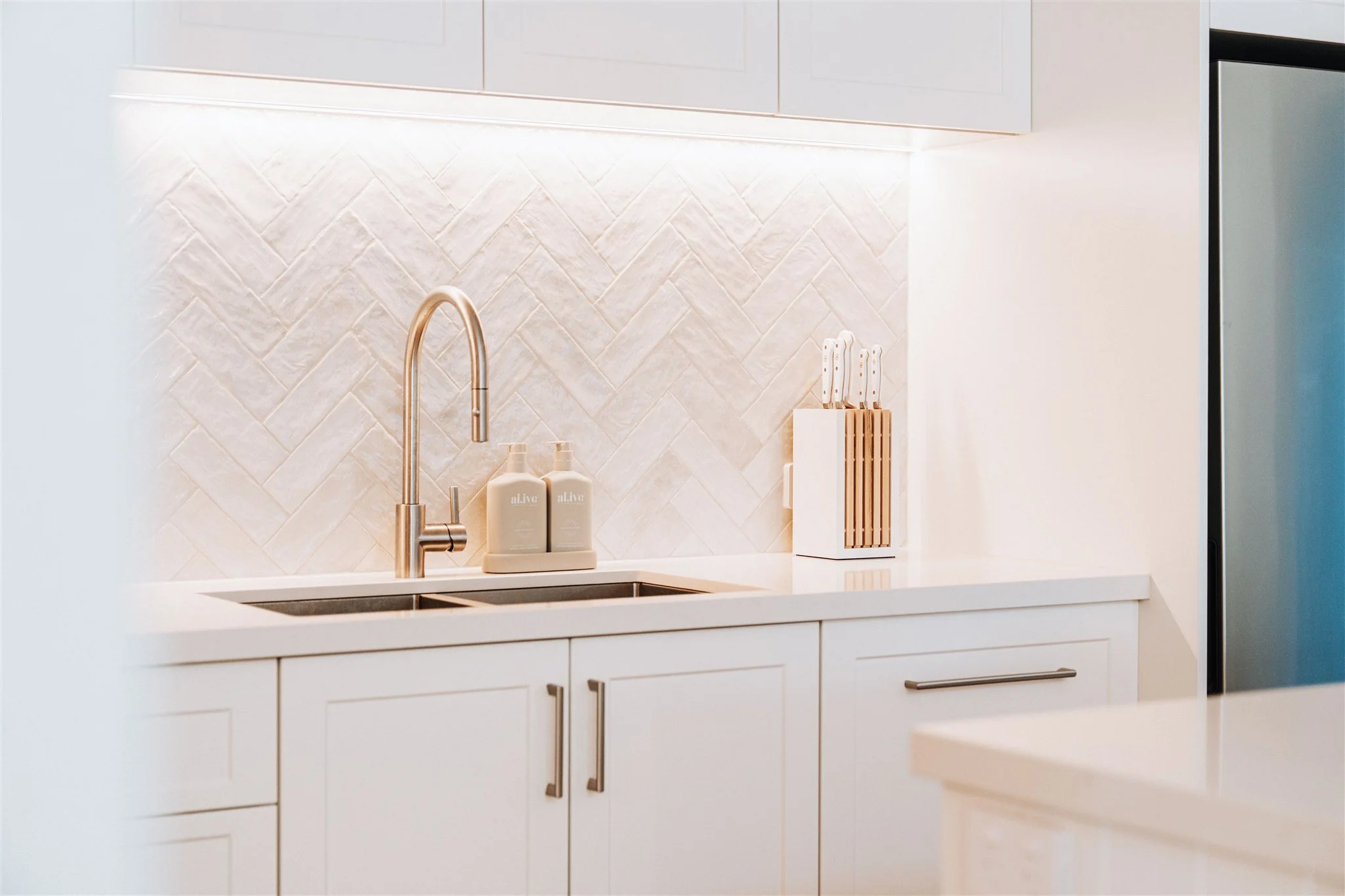 If your palette is light or tonal, texture becomes your best design tool. Mix profiles, introduce a tactile splashback, and pair smooth surfaces with something more organic like timber or rattan. These subtle contrasts bring warmth and interest without overwhelming the space.