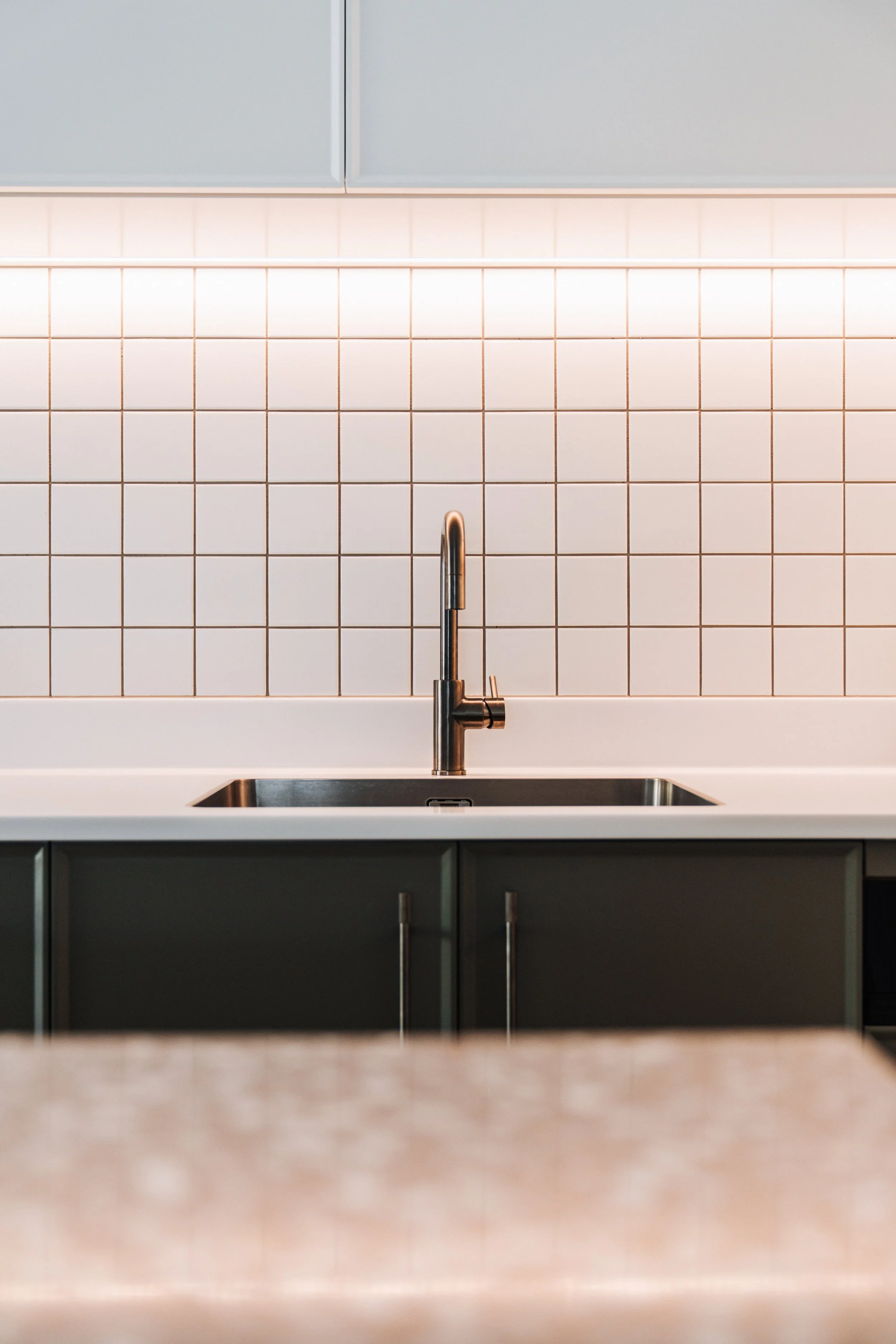 The 100mm upstand wasn’t just a visual feature, it was a functional one too. It keeps mess at bay and allows the white matt square tiles to stay clean and crisp. Those tiles, found at Byzantine Design, pair perfectly with the cabinetry and stone, while the darker grout, deliberately chosen to echo the Deep Gorge cabinetry, adds a dash of retro energy. It’s these subtle design moves that stitch the whole kitchen together.