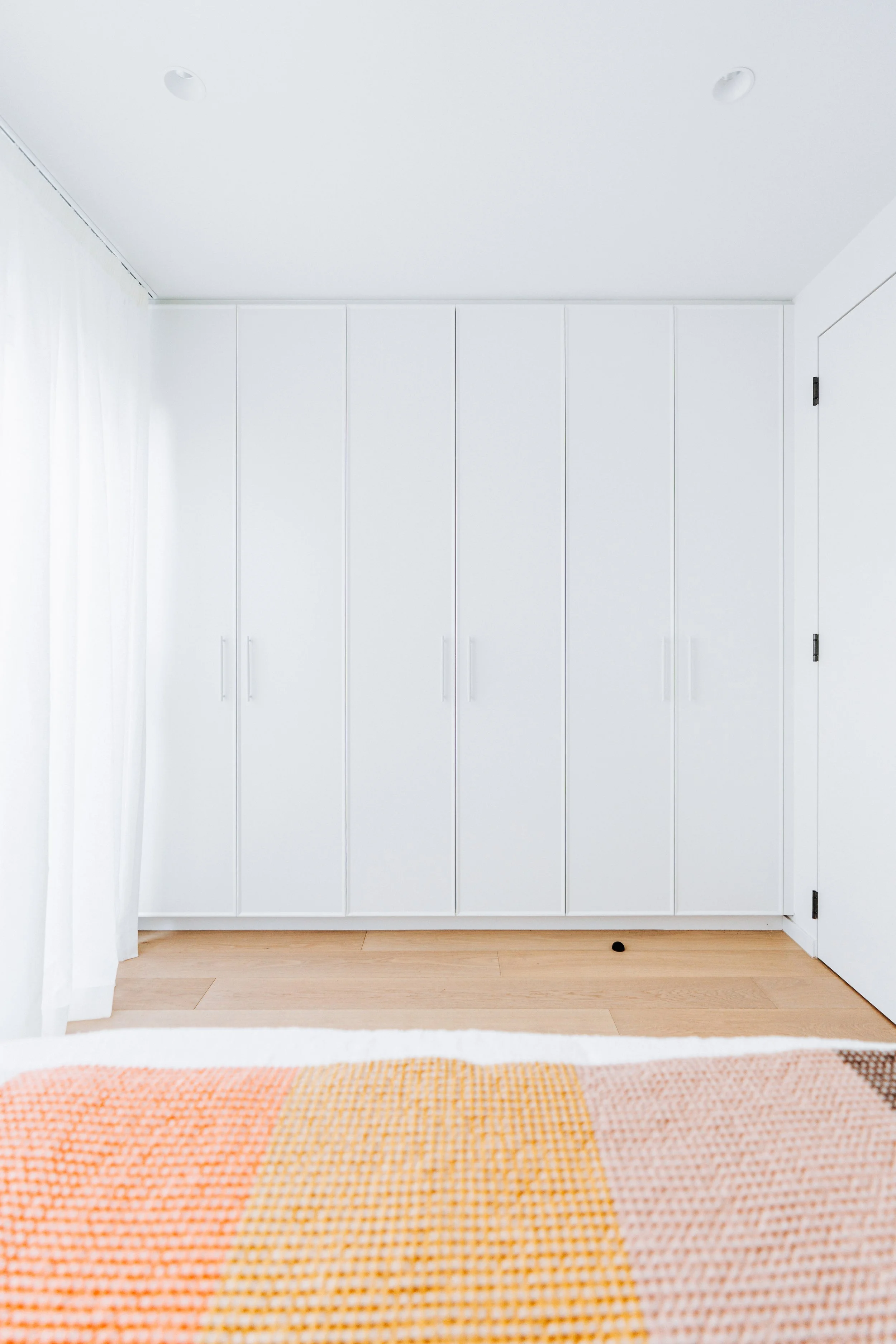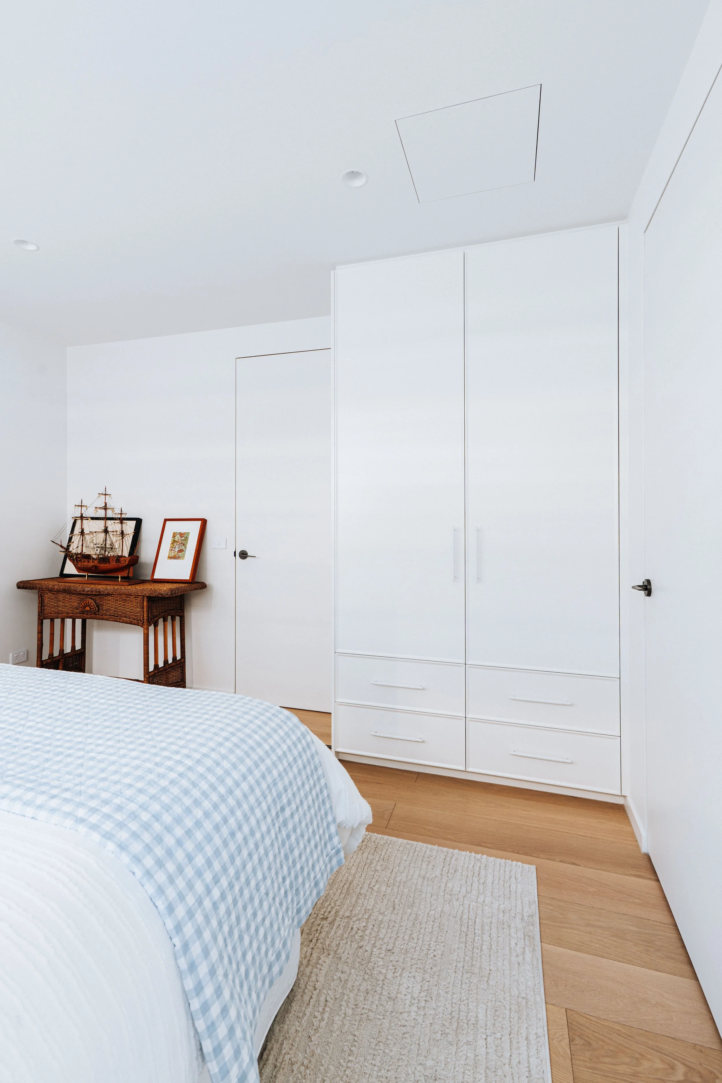 The wardrobes, tailored across three bedrooms, are as functional as they are refined. In the master suite, an eight-door run keeps things clean and minimal, concealing four drawers, six hanging zones, and six shelves for a well-balanced mix of storage. The first guest room is designed for ease, with four external drawers and two long hanging areas for visitors, plus high shelving for general storage. The second guest room plays a more versatile role, offering extended household storage behind six doors. Inside are eight drawers, three hanging zones, and seven shelves, all finished in the Malabar profile with Dulux Snowy Mountains Half and Bayside Luxe’s Toorak White Brass handles. Hafele chrome rails and thoughtful internal layouts ensure everything has its place.