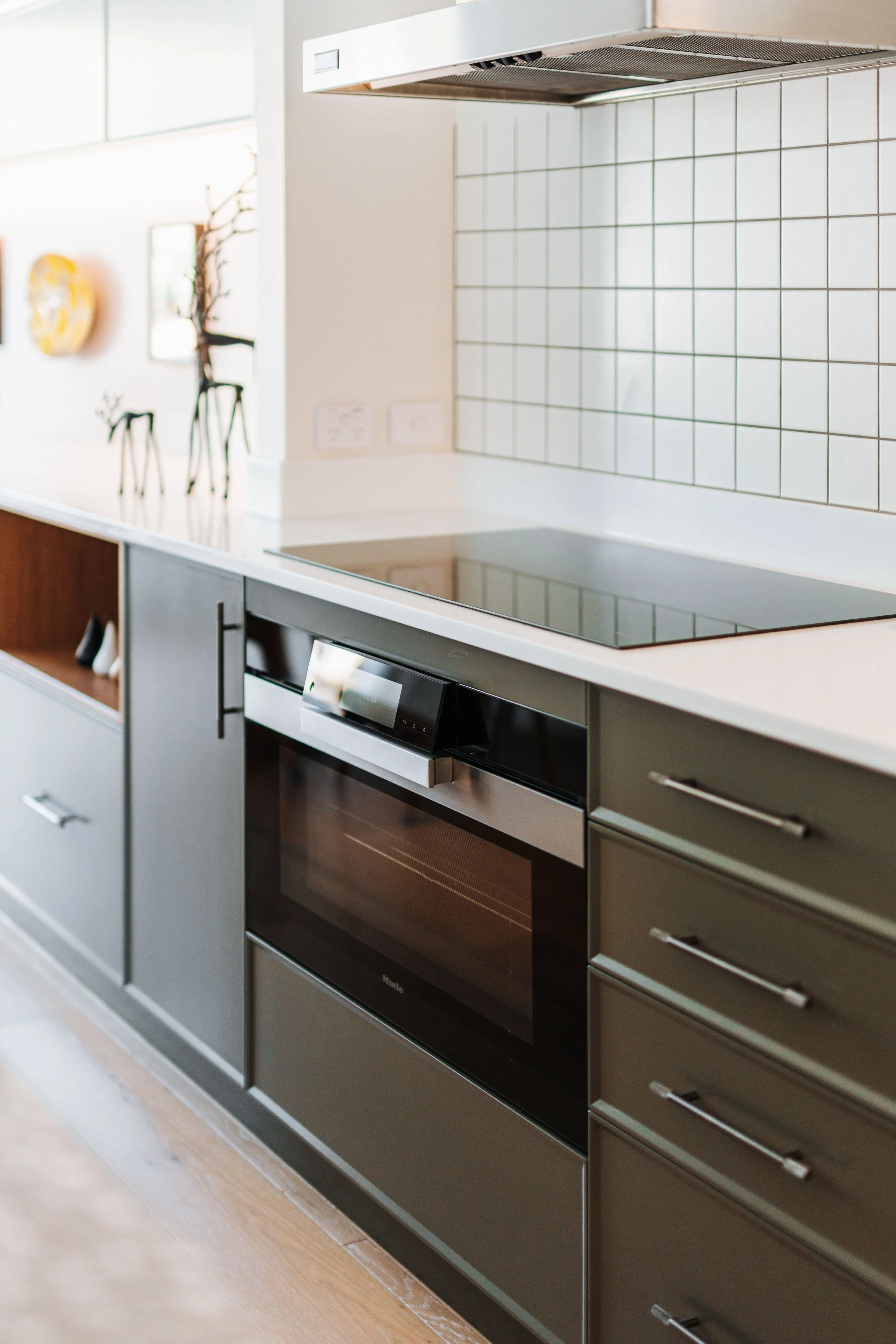Miele oven, induction cooktop, semi-integrated dishwasher, integrated fridge