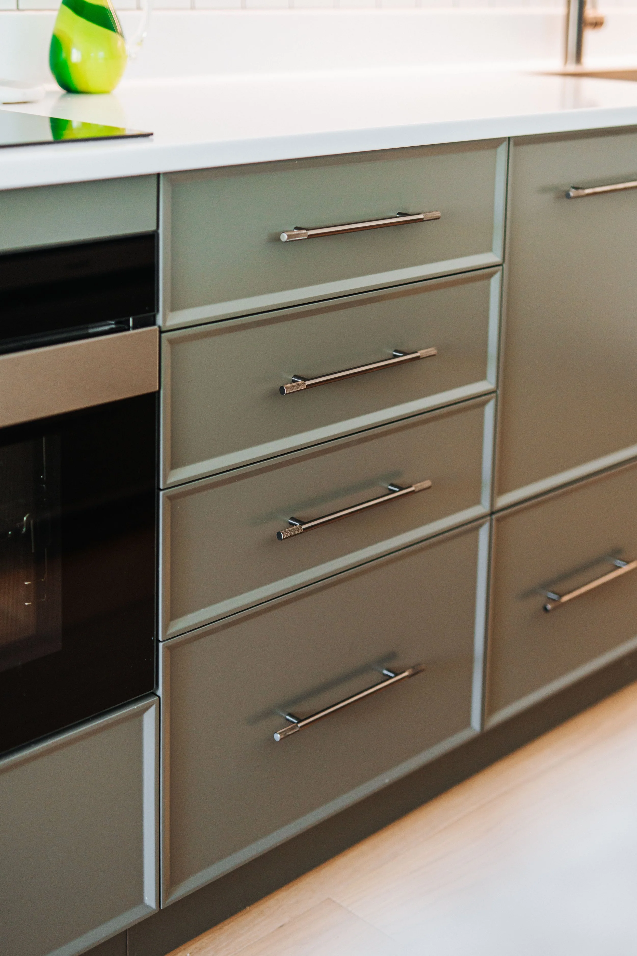 Nothing in this kitchen was left to chance, especially not the hardware. Cheryl’s keen eye for detail led her to Faucet Strommen’s Bar Pull End Knurl handles in Brushed Graphite, which she discovered while shopping at Design Precinct. Their knurled texture, Australian-made quality, and fingerprint-resistant finish made them an instant fit. They don’t just complement the cabinetry, they punctuate it.