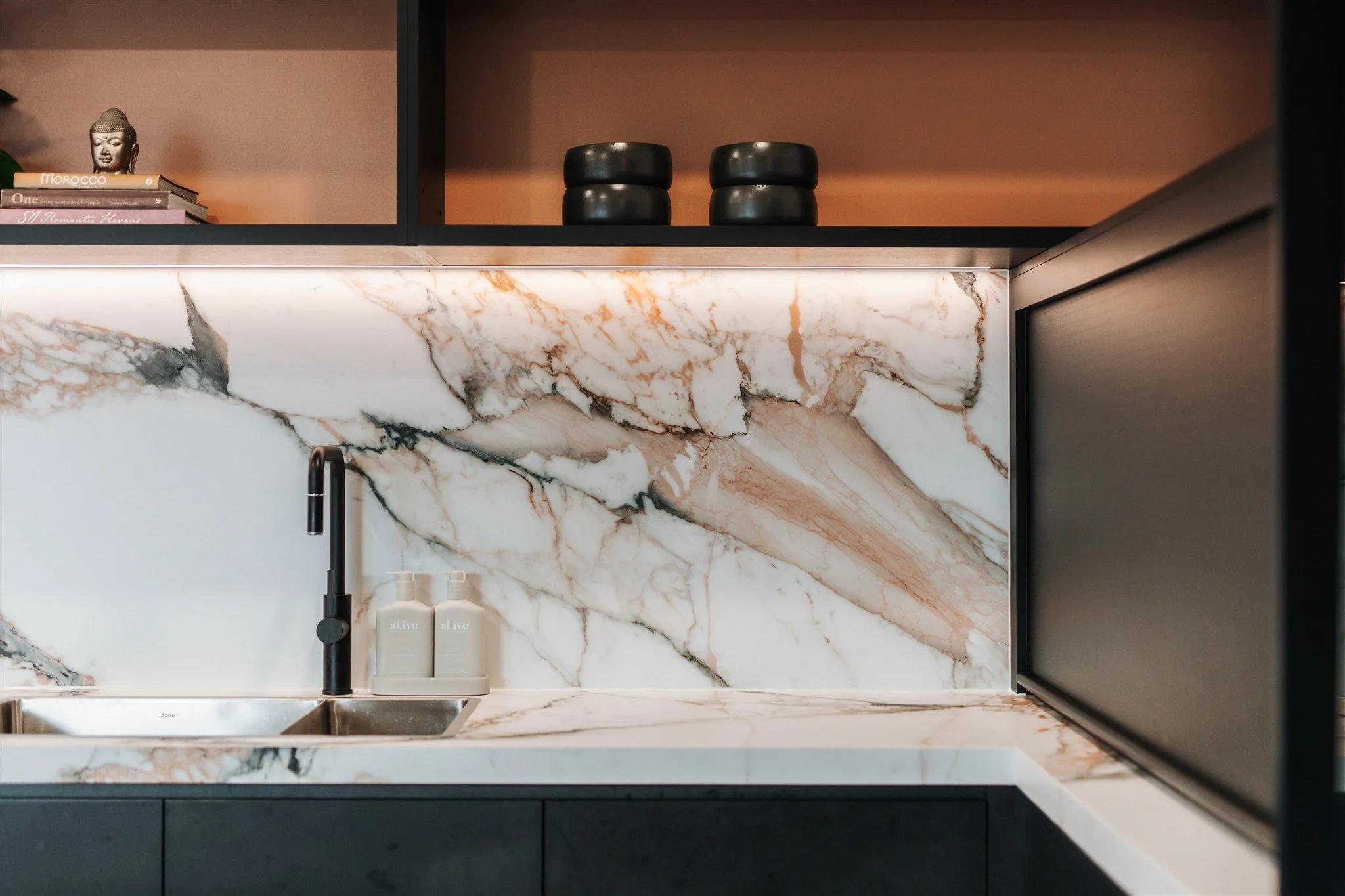 The transformation began with The Porcelain Factory Enviro 12 Calcutta Gold benchtops and splashbacks. Bold, expressive and instantly the star of the design. Their warm golden veining guided the cabinetry palette: a striking combination of Polytec Black Woodmatt and Polytec Copper Leaf Matt laminate. Using Copper Leaf as a backdrop for open shelving gave the room its unique flair, turning a practical feature into a statement.