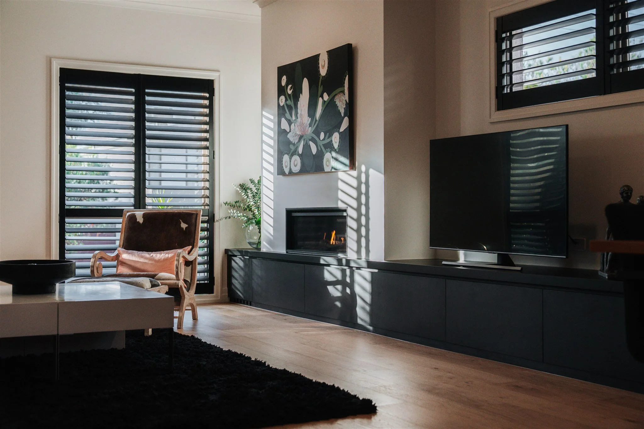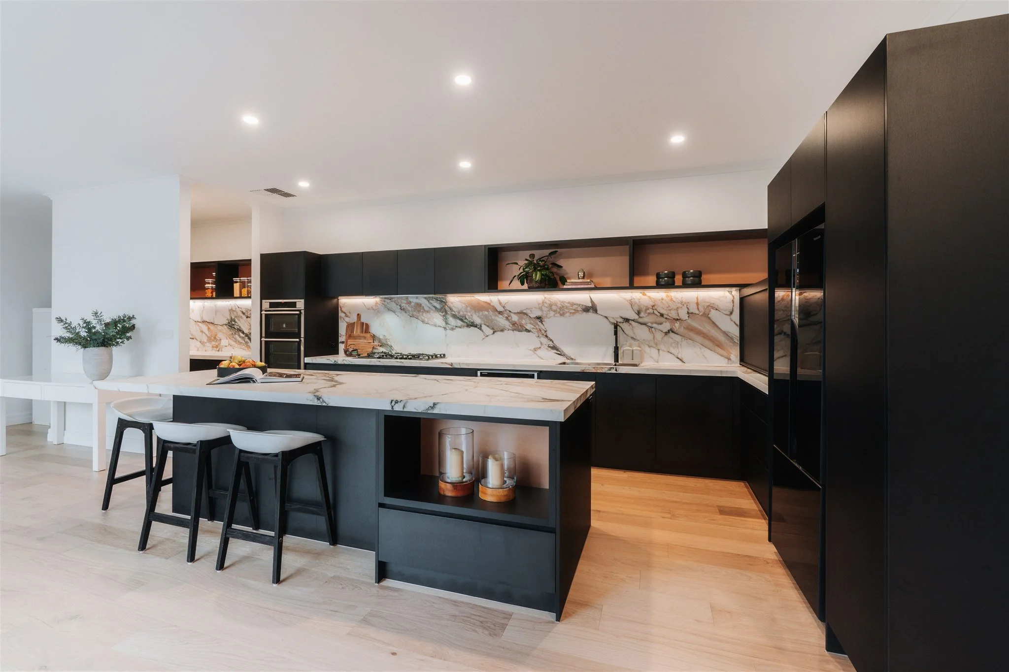 The design extended seamlessly into the living area, where cabinetry in Polytec Black Woodmatt paired with The Porcelain Factory Enviro 12 Jet Black benchtops carried the aesthetic forward. Quality Flooring timber underfoot grounded the palette, adding warmth and a natural connection across the open plan space.