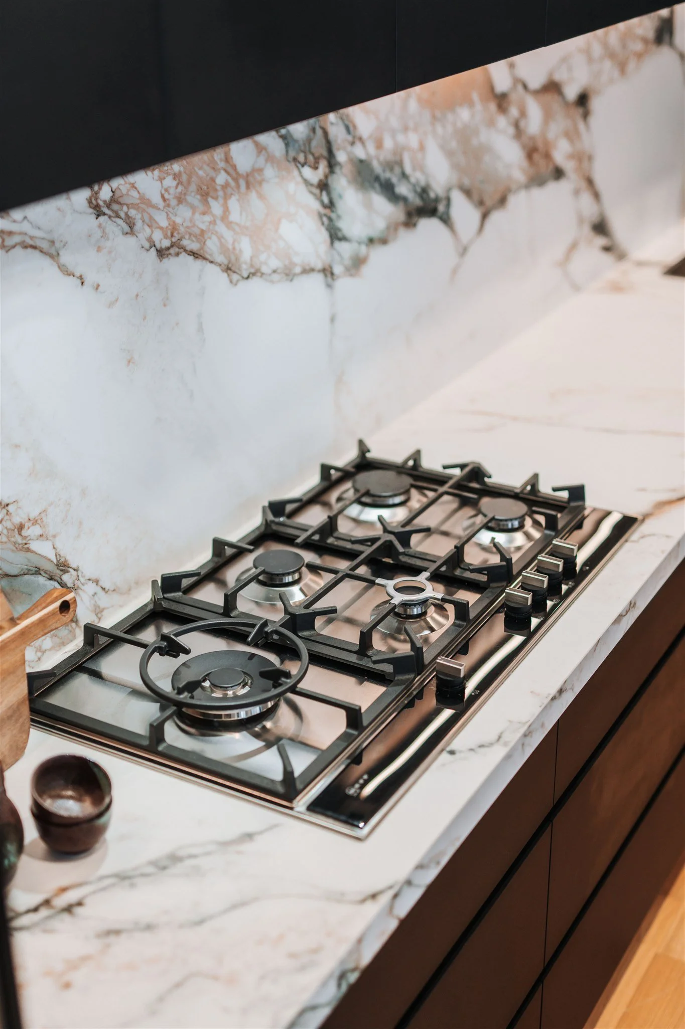 Appliances from E&S delivered on both performance and cohesion. The NEFF 90cm Natural Gas Cooktop with dual flame wok burner was chosen for its power and precision, paired with a NEFF under-cupboard rangehood. Everyday use was elevated by the Armando Vicario Luzb Gooseneck Pull Out Mixer Tap and an Abey Lucia Bowl & Three Quarter Sink, both blending style with practicality.